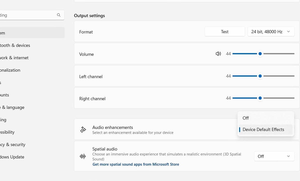Derudover skal du åbne Windows 11-indstillinger Gå til System > Lyd > Output, og klik på indstillingen Højttalere for den relevante enhed. Indstil alle lydstyrkeniveauer til det samme niveau i sektionen Lyd og sørg for, at indstillingen Lydforbedringer er indstillet til Device Default Effects.
