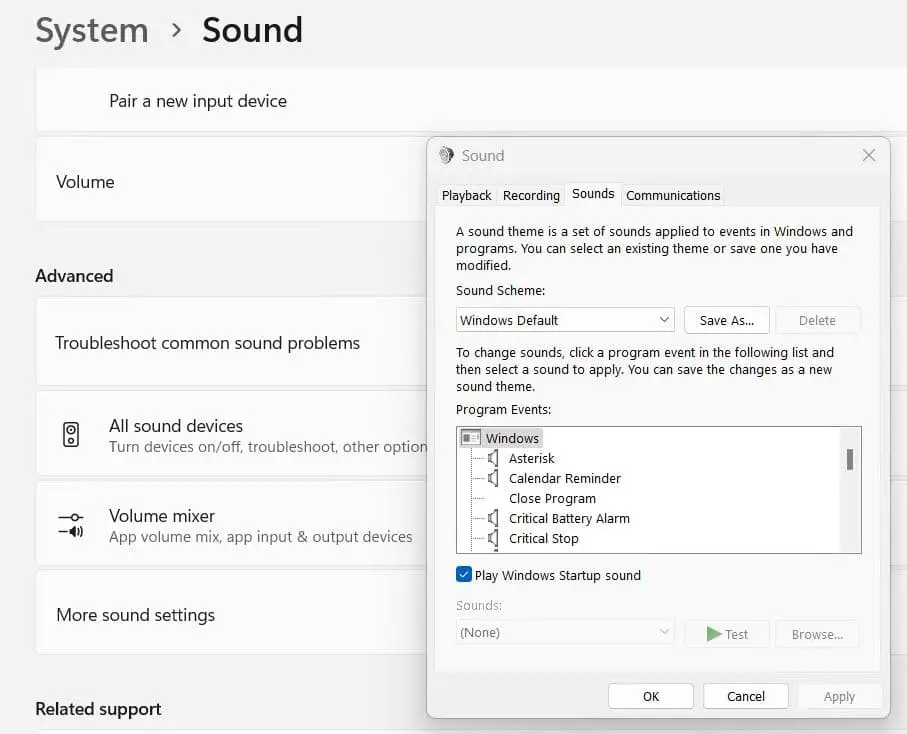 - Vælg Windows Default fra rullemenuen under indstillingen Sound Scheme.
