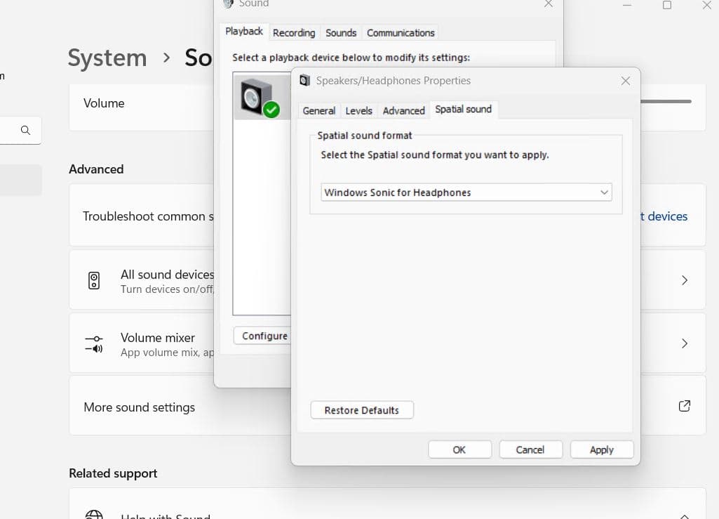 - Klik på fanen Spatial sound, og klik derefter på knappen Gendan standarder.