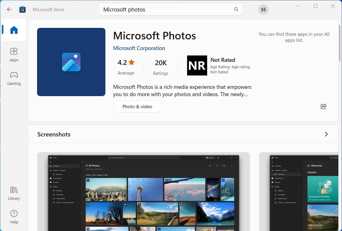- Genstart derefter din computer, åbn Microsoft Store og søg efter Microsoft Photos,