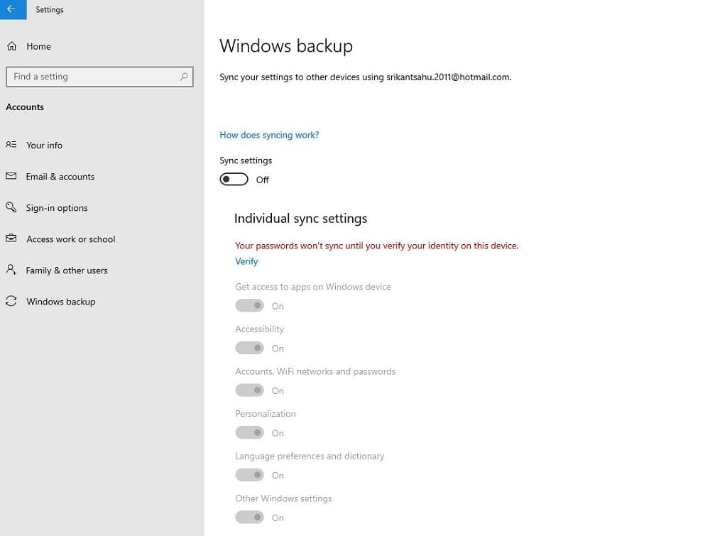 - Åbn Windows 10 Indstillinger Gå til Konti og derefter Windows backup