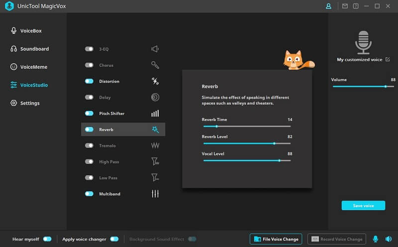 - Trin 5: Du kan også få en brugerdefineret stemme ved at navigere til VoiceStudio. Her bliver du nødt til at justere den brugerdefinerede indstilling til at lyde som en dyb robot, som Pitch Shifter, Reverb, Tremolo, Distortion osv., for at få stemmen som Stormtrooper.