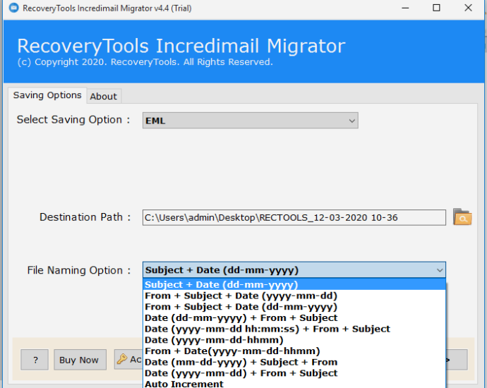 - IncrediMail IML til EML Converter tilbyder flere konverteringsmuligheder for filnavngivning til at vedligeholde de resulterende filer efter dato, emne, fra, tid osv.