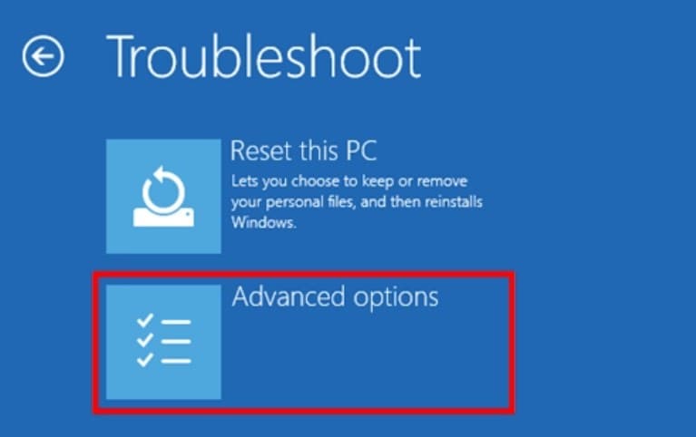 - KlikAvancerede indstillingerfor at få adgang til menuen opstartsindstillinger.