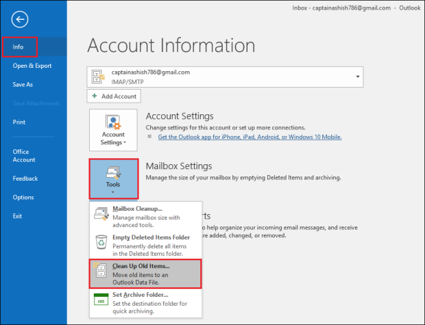 - Gå til i OutlookFil>>Info>> vælgOprydning af postkassevalgmulighed.