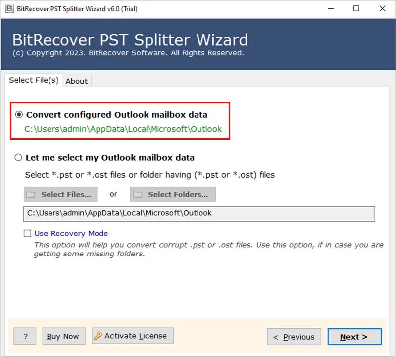- Tilføj OST-filen manuelt vhaVælg FilerogVælg Mappermulighed eller automatisk ved at bruge "Konverter konfigurerede Outlook-postkassedata" mulighed.
