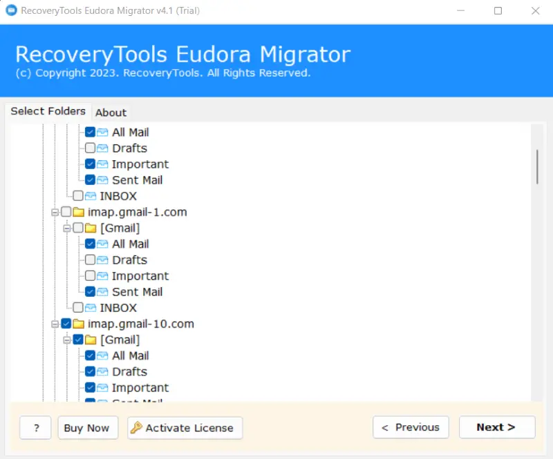 - Tjek de nødvendige mapper og undermapper fra skærmen og knappen Næste for at fortsætte.