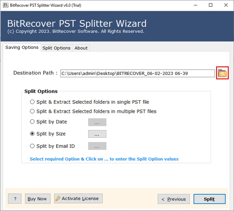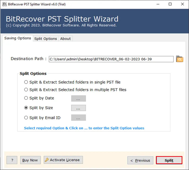 - Brugere kan opdele PST-filer via størrelse i 2 GB, 5 GB, 10 GB og 20 GB.