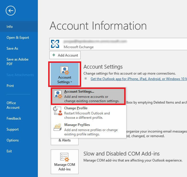 - Klik påFil>>Kontoindstillinger>>Kontoindstillingermuligheder.