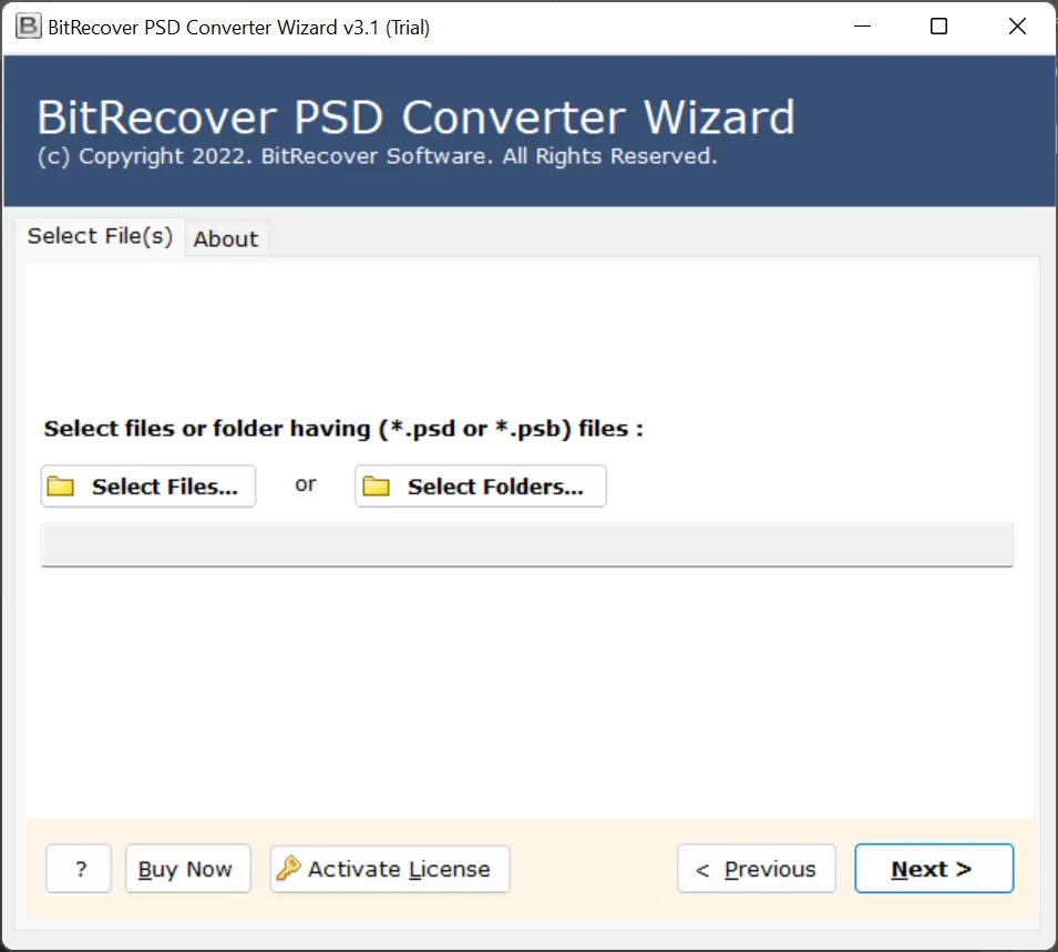 - Softwaren har to muligheder, dvs. Vælg filer eller Vælg mapper for nemt at uploade Photoshop PSD-filer i software-GUI.