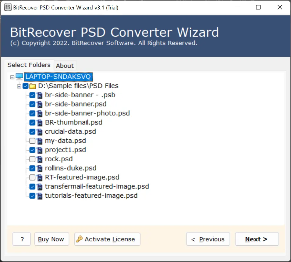 - Før PSD til BMP konverteringsprocessen startes, viser softwaren alle PSD'er i softwarepanelet. Brugere kan kun vælge specifikke filer til at konvertere PSD til Bitmap.