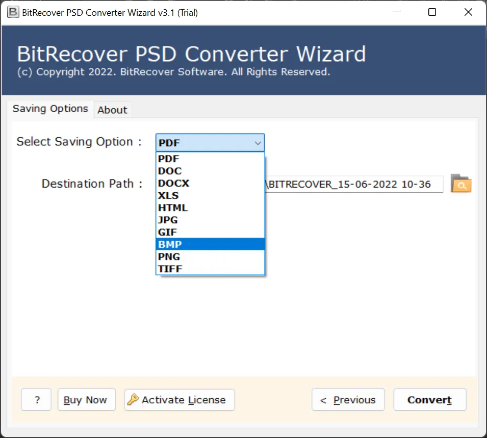 - Vælg derefterBMPsom en gemmemulighed fra rullelisten for at konvertere PSD til Bitmap.