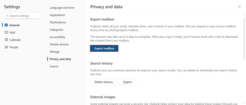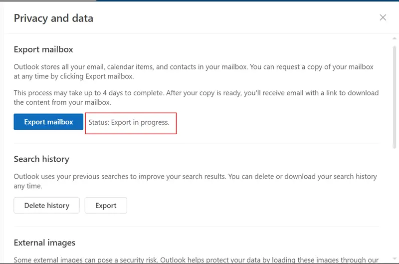 - Klik påEksporter postkasseknappen for at fortsætte.