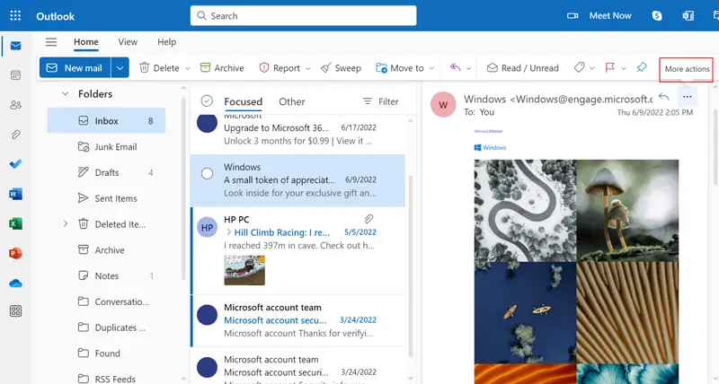 - Åbn aHotmail e-mailsom du ønsker at downloade og vælgeFlere handlinger.