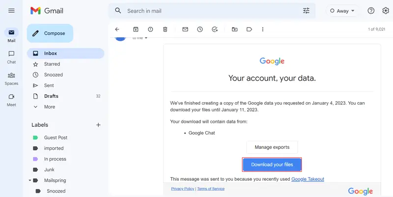 - Log ind på din Gmail-konto og åbn takeout-mail og klik påDownload dine filerknap.