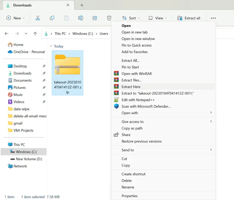 - Få takeout eksporterede chats fra downloadmappen ogudpak ZIP-filen.