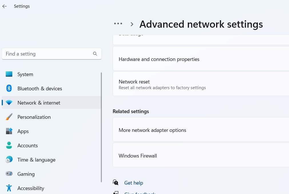- Skift til fanen Netværk og internet til venstre og gå til Avancerede netværksindstillinger.