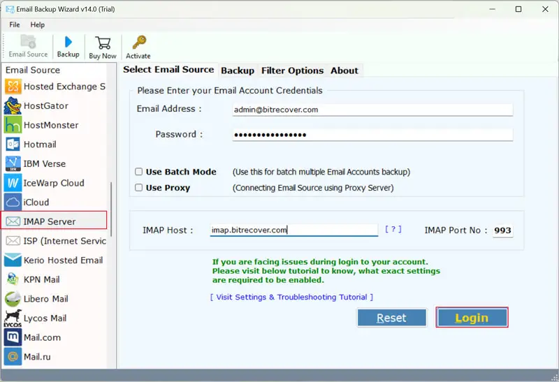 - Kør den foreslåede software og vælgIMAP-serverfra e-mail-kildelisten.
