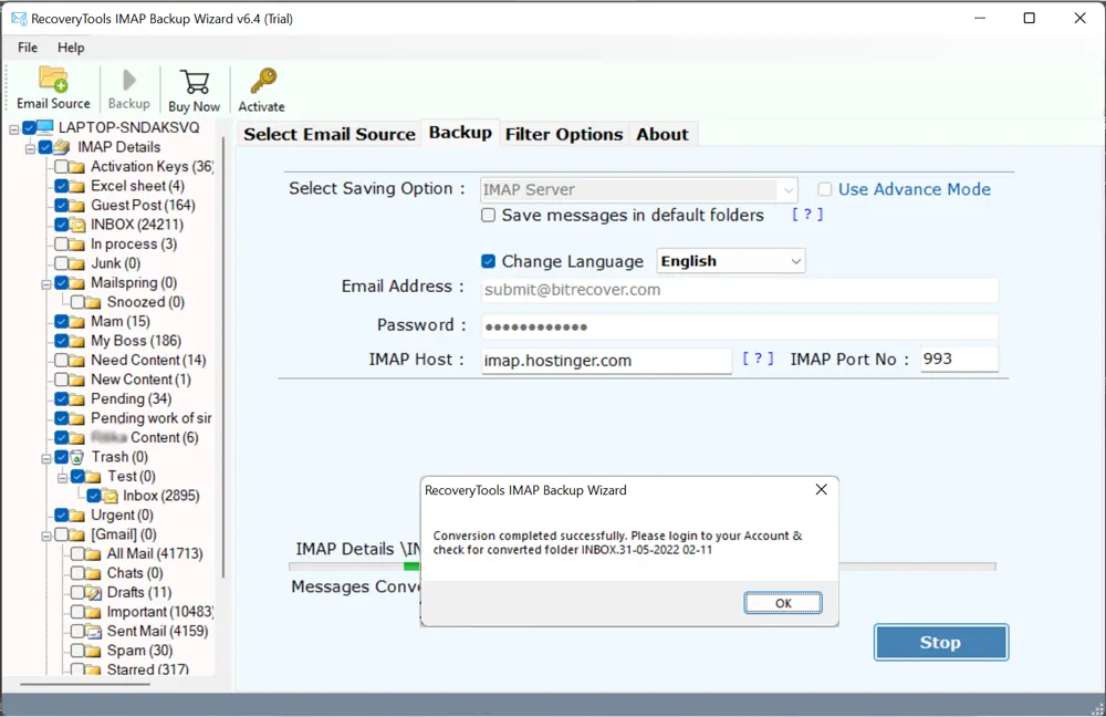 - Udfyld MDaemon Server IMAP detaljer og tryk påBackupknap.