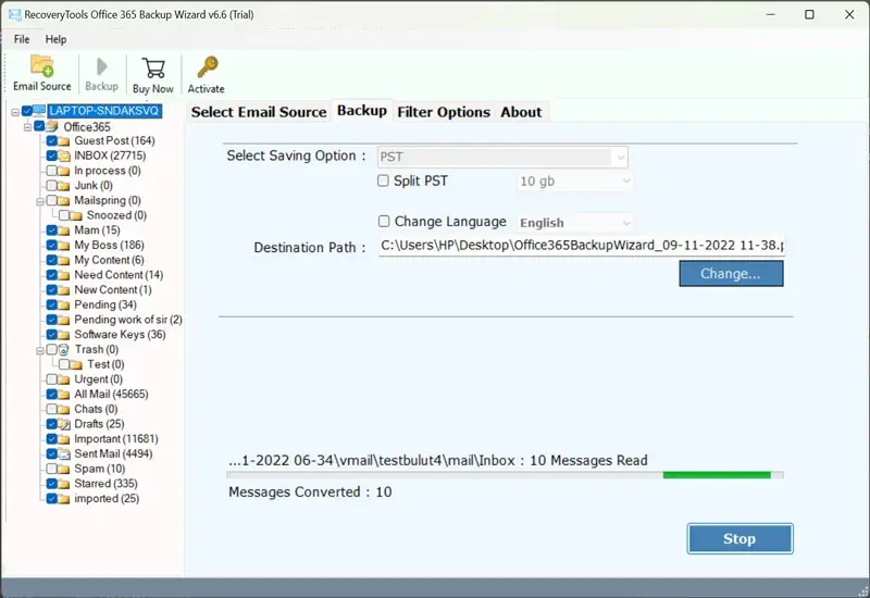 - Klik påBackupfor at gemme alle e-mails fra Outlook 365 til harddisken.