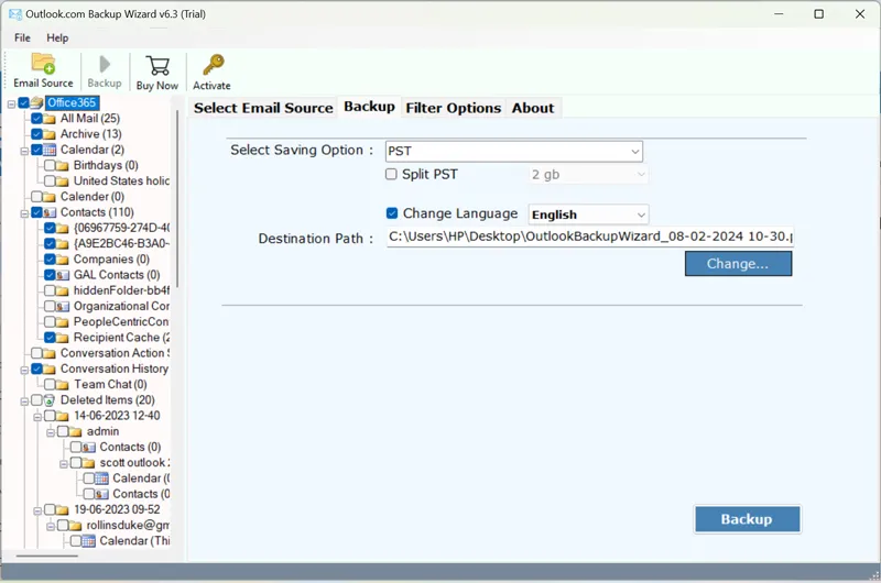 - Gennemse derefterdestinationsmappefor at gemme outputdata, og tryk påBackup.