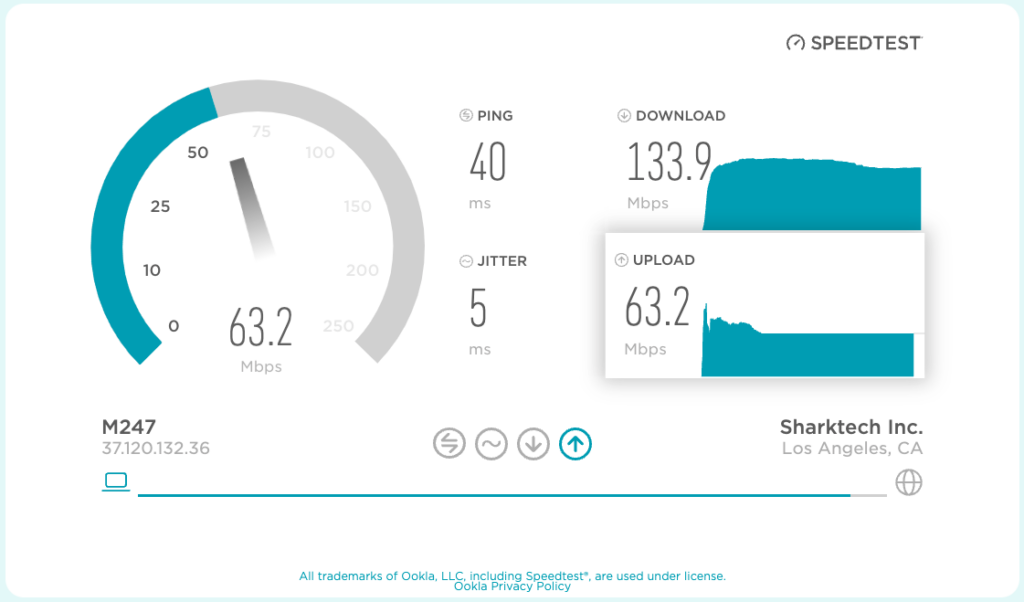 Nu, da jeg oprettede forbindelse til en Atlas VPN-fri server placeret i Los Angeles, så jeg kun et lille fald fra 140 Mbps til 133 Mbps, hvilket er ret godt for en gratis tjeneste.