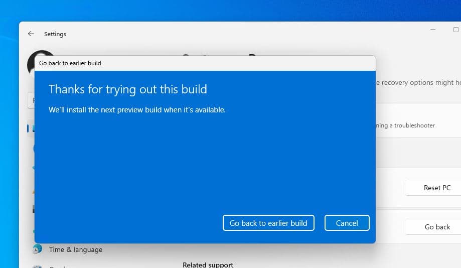 - Til sidst vil du få en skærm, der siger Tak for at prøve denne build med muligheden for at gå tilbage til den tidligere build-knap og klikke på den.