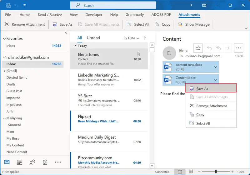- For at udtrække vedhæftede filer fra Outlook skal du klikke på vedhæftet fil >Gem som.