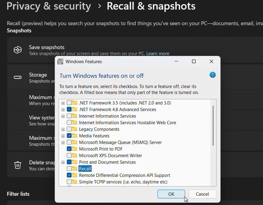 Tilfjern Recall helt, gå til Slå Windows-funktioner til eller fra, fjern markeringen i Genkald, og genstart pc'en. Dette sletter alle tidligere gemte snapshots. Genaktivering af Recall kræver den samme proces.