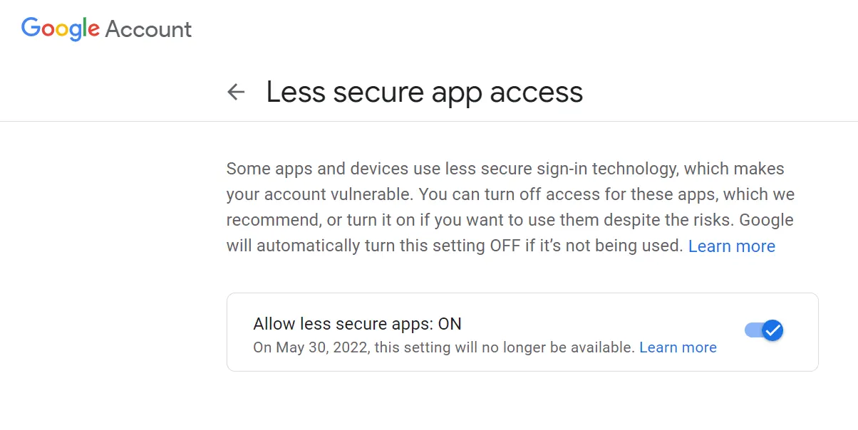 Bemærk at -Mindre sikker appadgang bør være aktiveret, hvis du vil migrere SME Mail til Gmail og Google Workspace. Hvis mindre sikker app-adgang deaktiveres, viser softwaren en fejlmeddelelse. Aktiver det nu – https://myaccount.google.com/lesssecureapps