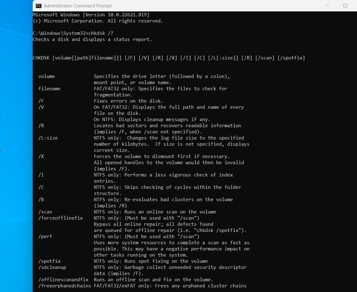 - Du skal tilføje nogle ekstra parametre for at rette diskdrevfejl, du kan få disse parametre ved at bruge kommandoenchkdsk /?