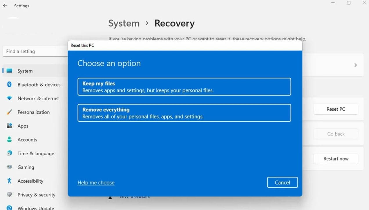 - Fjern alt: Denne mulighed geninstallerer Windows fuldstændigt og fjerner alle personlige filer, apps og indstillinger. Din pc vil blive gendannet til sin oprindelige tilstand.