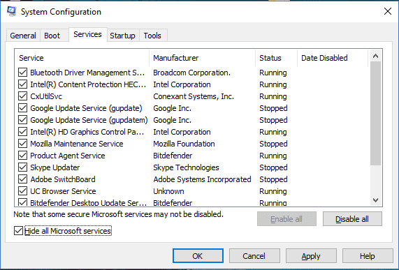 Tjek nu problemets status. Gør dette trinvist, for hvert program, en efter en deaktiver de tilsvarende tjenester og fortsæt med at tjekke, tjek om problemet løser sig.