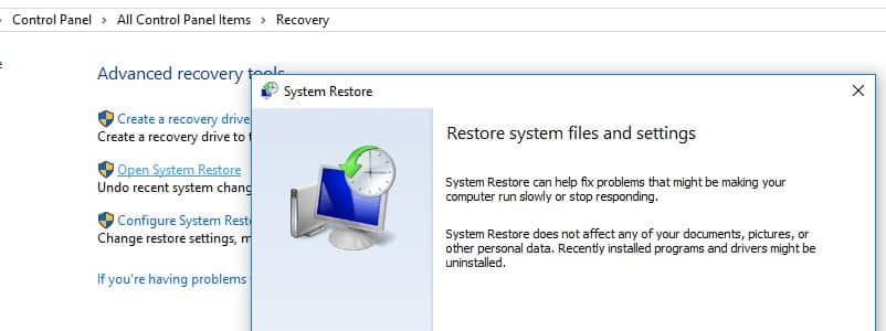 - Hvis BSOD-fejl begyndte at opstå efter en nylig softwareinstallation eller systemopdatering, skal du bruge Systemgendannelse til at gendanne systemet til en tidligere stabil konfiguration.