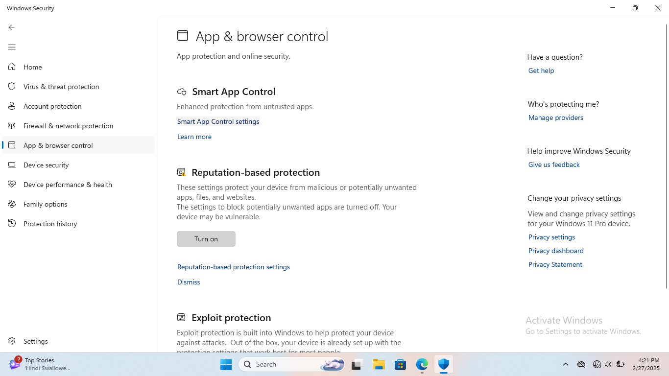 Trin 2-Vælg App & browse control > Smart App Control indstillinger.