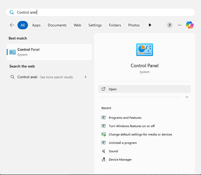 Trin 1-Gå til Start og søg Kontrolpanel. Åbn det første resultat.