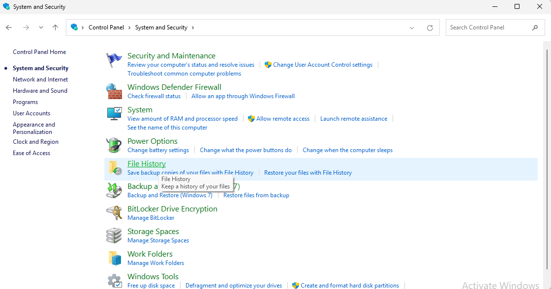 Trin 2-Vælg System og sikkerhed > Filhistorik.