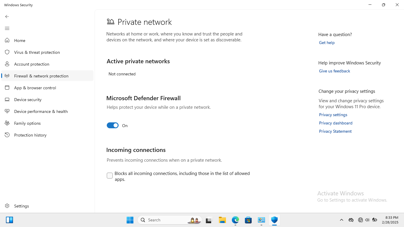 Trin 1-Gå til Windows-sikkerhed>Firewall og netværksbeskyttelse> Privat netværk (aktivt).