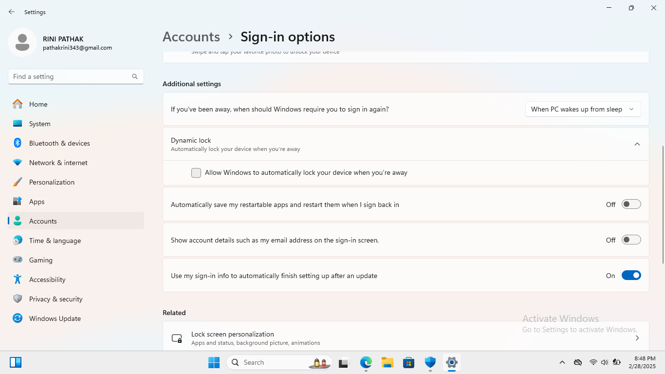 Trin 7-Vælg derefter Konti>Login-indstillinger>Dynamisk lås.