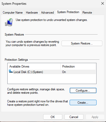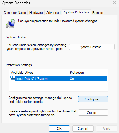 Trin 2-For det andet skal du klikke på systemdrevet (C). Vælg derefter Konfigurer i afsnittet Beskyttelsesindstillinger.