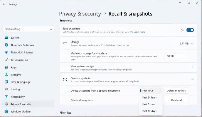 Trin 1-Gå til Indstillinger>Privatliv og sikkerhed>Genkald og snapshots.