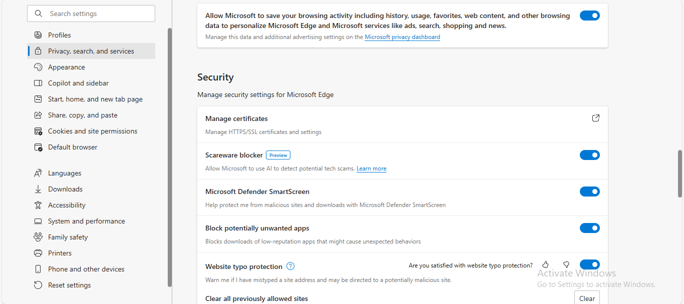 Trin 2-Vælg derefter Privatliv, søgning og tjenester>Sikkerhed