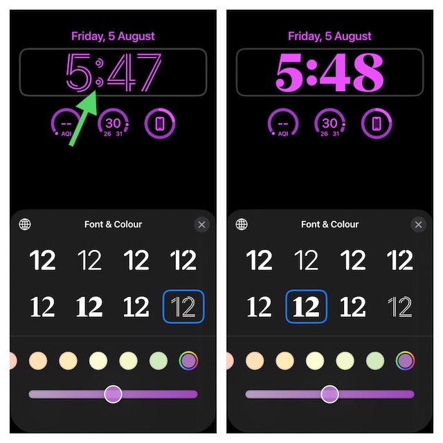 Hvis du ønsker at tage låseskærmtilpasningen til næste niveau, bør du tilpasse skrifttyperne og farverne. Den seneste iteration af iOS tilbyder en god samling af skrifttyper, så du kan vælge en fin til at pryde din låseskærm. Hvad mere er, lader den dig også justere farven for at sikre, at den altid er i overensstemmelse med din stilkvotient.
