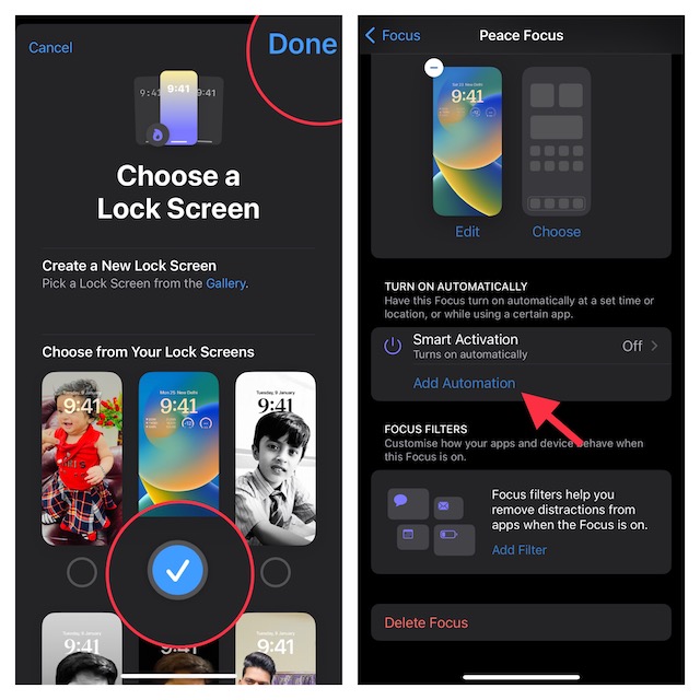 ÅbnIndstillinger app på din iPhone -> Fokus -> "+" knapi øverste højre hjørne af skærmen –> Brugerdefineret. Opret nu en ny Focus-profil. Derefter skal du oprette en ny låseskærm eller vælge en allerede oprettet låseskærm. Derefter automatiser den til at blive aktiv, når og når du vil have den.