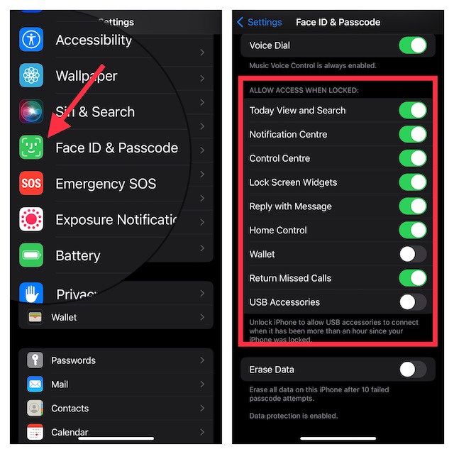 - Under Tillad adgang ved ulåst sektion skal du slå kontakterne fra/til ved siden af hver mulighed som Visning og søgning i dag, Kontrolcenter, Notifikationscenter, Låseskærm-widgets, svar med iMessage, Home Control, tegnebog, returnere ubesvarede opkald og USB-tilbehør. Fra nu af vil ingen kunne få adgang til disse funktioner fra låseskærmen.