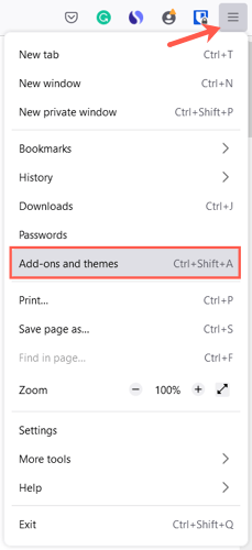 For nemt at få adgang til temasektionen i dine Firefox-browserindstillinger skal du vælgetre linjerøverst til højre i vinduet for at seApplikationsmenu. VælgeTilføjelser og temaer.