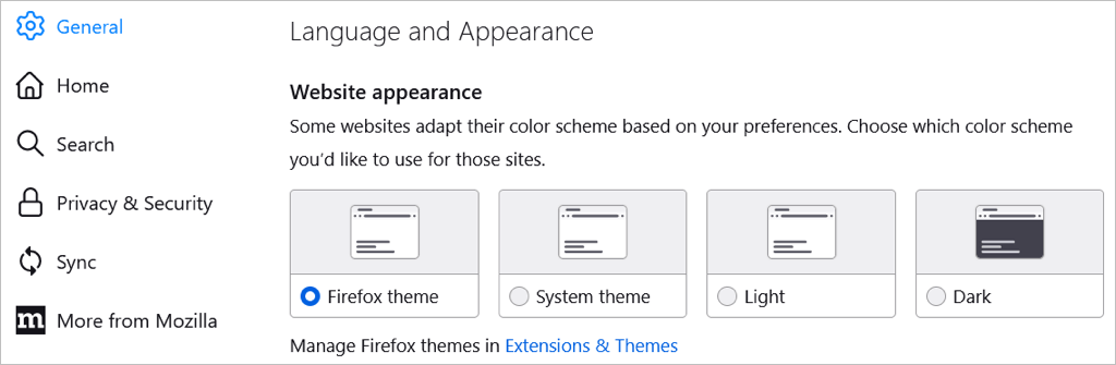 UnderSprog og udseende, kan du vælge et farveskema for websteder som dit systemtema, lys tilstand eller mørk tilstand.