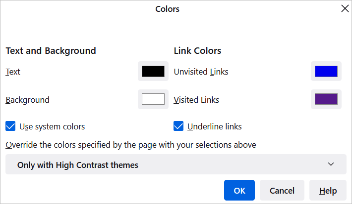 For at ændre skrifttypestil eller -størrelse eller tilsidesætte Firefoxs standardfarver til tekst og websidebaggrunde, skal du gå til Indstillinger.