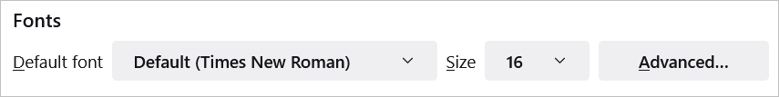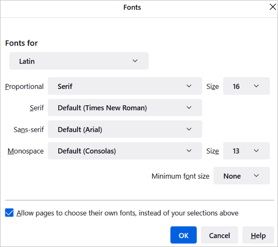 Vælg derefterFremskredenat vælge specifikke skrifttyper og -størrelser til proportional-, serif-, sans-serif- og monospace-skrifttyper. Du kan også vælge en minimumsskriftstørrelse.