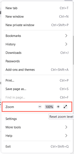For kun at vælge en zoom for den aktuelle side skal du åbneApplikationsmenuøverst til højre. Ved siden afZoom, brug plus- eller minusknappen til at øge eller mindske zoomen og vælg det aktuelle niveau for at nulstille zoomen.